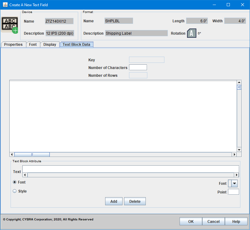 The Create A New Text (Block) Field dialog is used to add new text block fields to your format. When editing an existing text block field, an exact duplicate dialog called Edit A Text (Block) Field is displayed instead.
