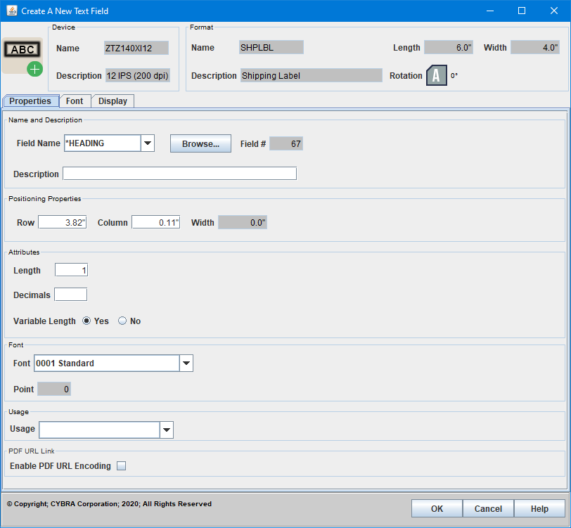- Length - Field length. If Field Name is *HEADING, this value will match the length of information typed in Description. If the Text field is a variable field, this defines the maximum length of data that can be passed into the variable Text field at print time.