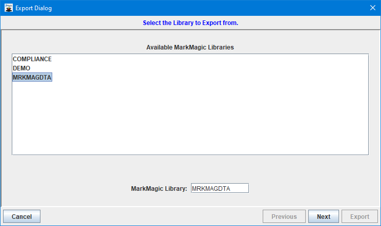 The Export tool is used to save off one or more MMPI objects to an XML file on your PC. MarkMagic objects that can be exported include Print Monitors, Jobs, Formats, Graphics, RuleSets, and Text Blocks. The file created using the export utility can then be transferred to another system and used to import those objects into another MarkMagic environment. Please see Utilities - Import for more information on that.