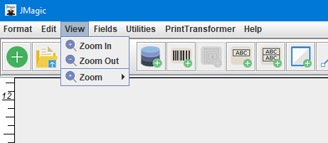 The View menu contains options for controlling the Zoom factor. Options to Zoom In and Zoom Out are located here. There are also buttons for Zoom In and Zoom Out on the Primary Design Buttons row.